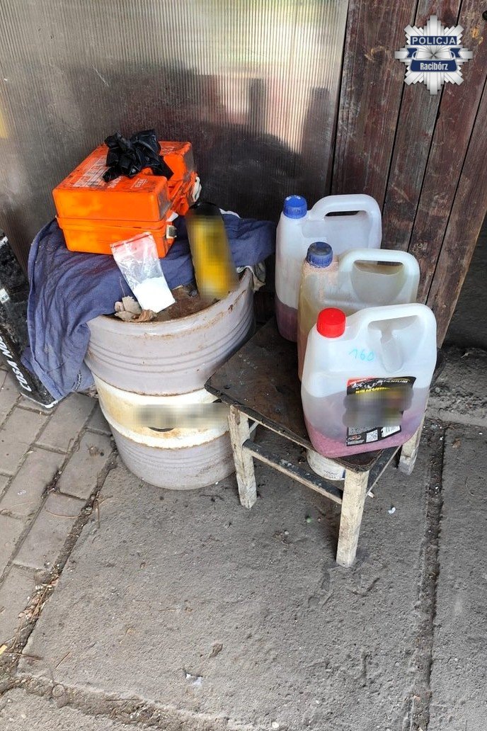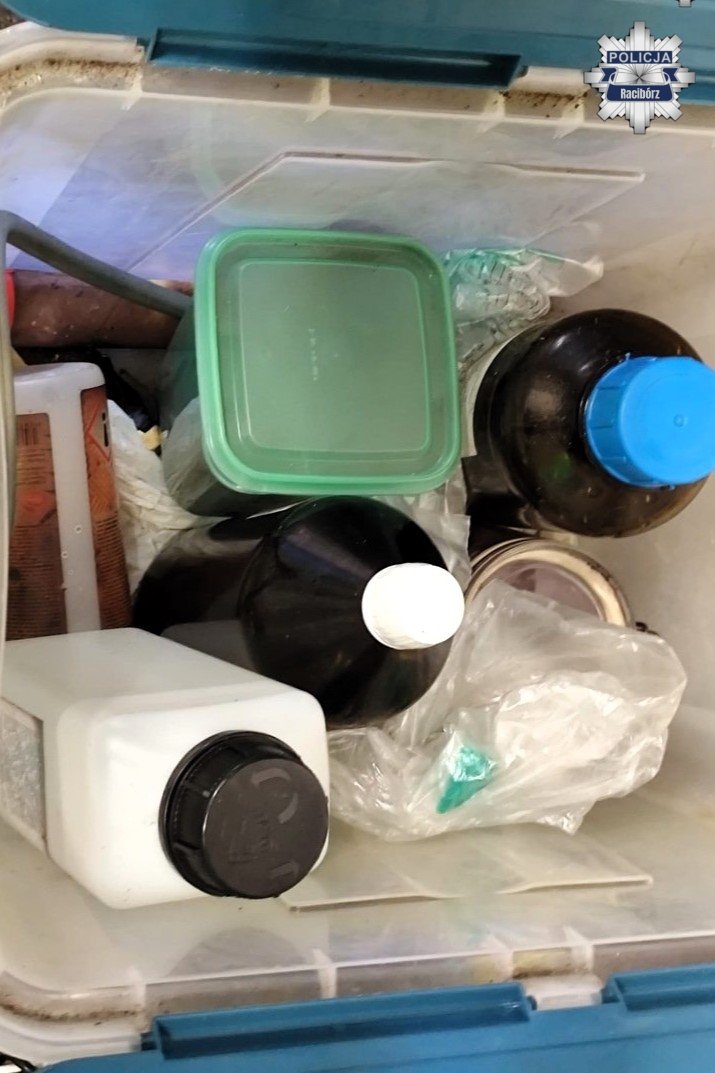 W garażu należącym do mieszkańca gminy Krzyżanowice znajdował się kompletny sprzęt oraz prekursory wykorzystywane do produkcji substancji psychotropowych, w tym plastikowe baniaki z cieczą i odczynniki chemiczne.