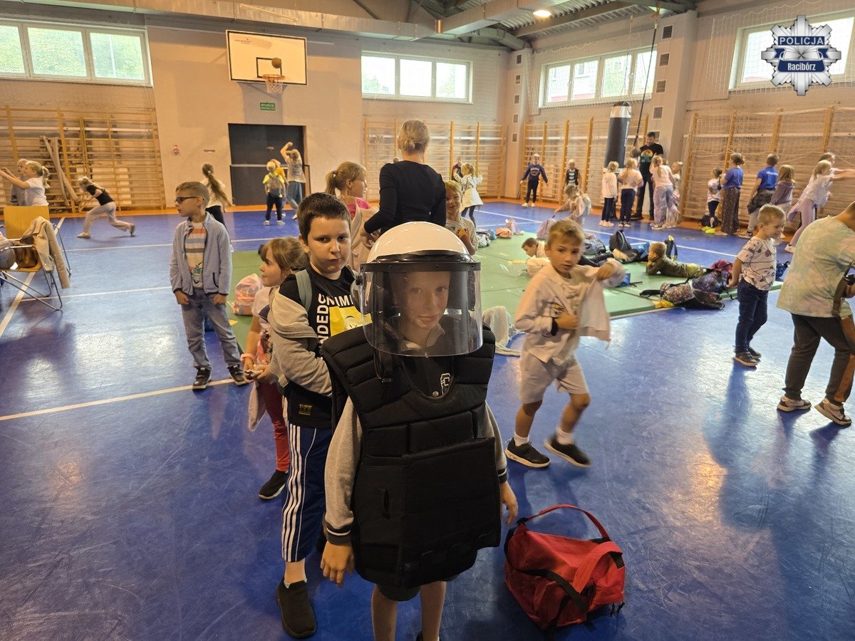 Kolejnym punktem programu było spotkanie na sali gimnastycznej, gdzie przygotowano pokaz sprzętu wykorzystywanego przez funkcjonariuszy. Uczniowie mogli zobaczyć m.in. umundurowanie ochronne używanego podczas zabezpieczania imprez masowych. Dużą atrakcją była możliwość przymierzenia wybranych elementów sprzętu, co pozwoliło dzieciom poczuć się choć na chwilę jak prawdziwi policjanci. Funkcjonariusze zaprezentowali również broń służbową, przybliżając zasady jej bezpiecznego użytkowania i wyjaśniając, w jakich sytuacjach jest ona wykorzystywana.
