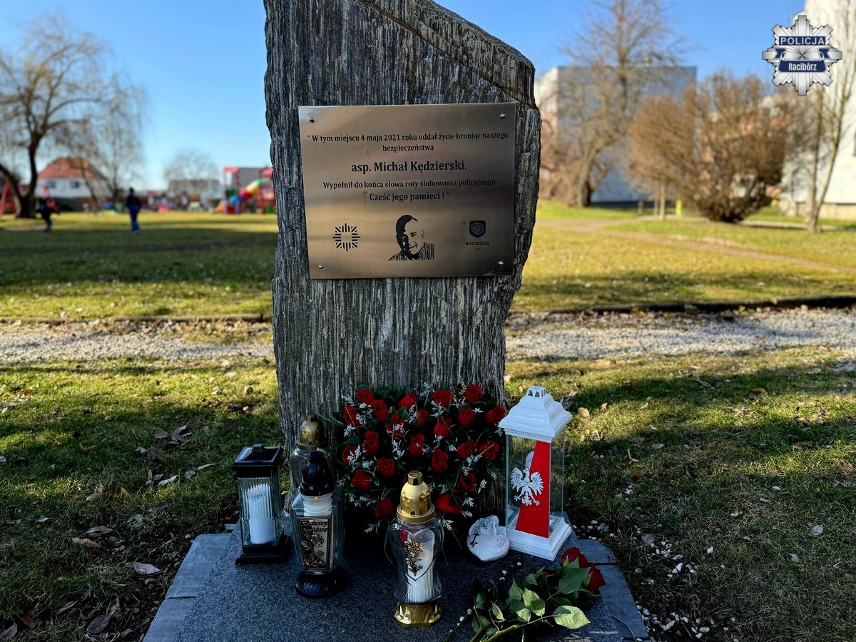 Z tej okazji Komendant Powiatowy Policji w Raciborzu mł. insp. Tomasz Hynek wraz ze swoim zastępcą mł. insp. Mirosławem Mielańczykiem uczcili pamięć asp. Michała Kędzierskiego, który w maju 2021 roku został śmiertelnie postrzelony podczas interwencji. Przy obelisku upamiętniającym tragicznie zmarłego policjanta zapalono znicz.