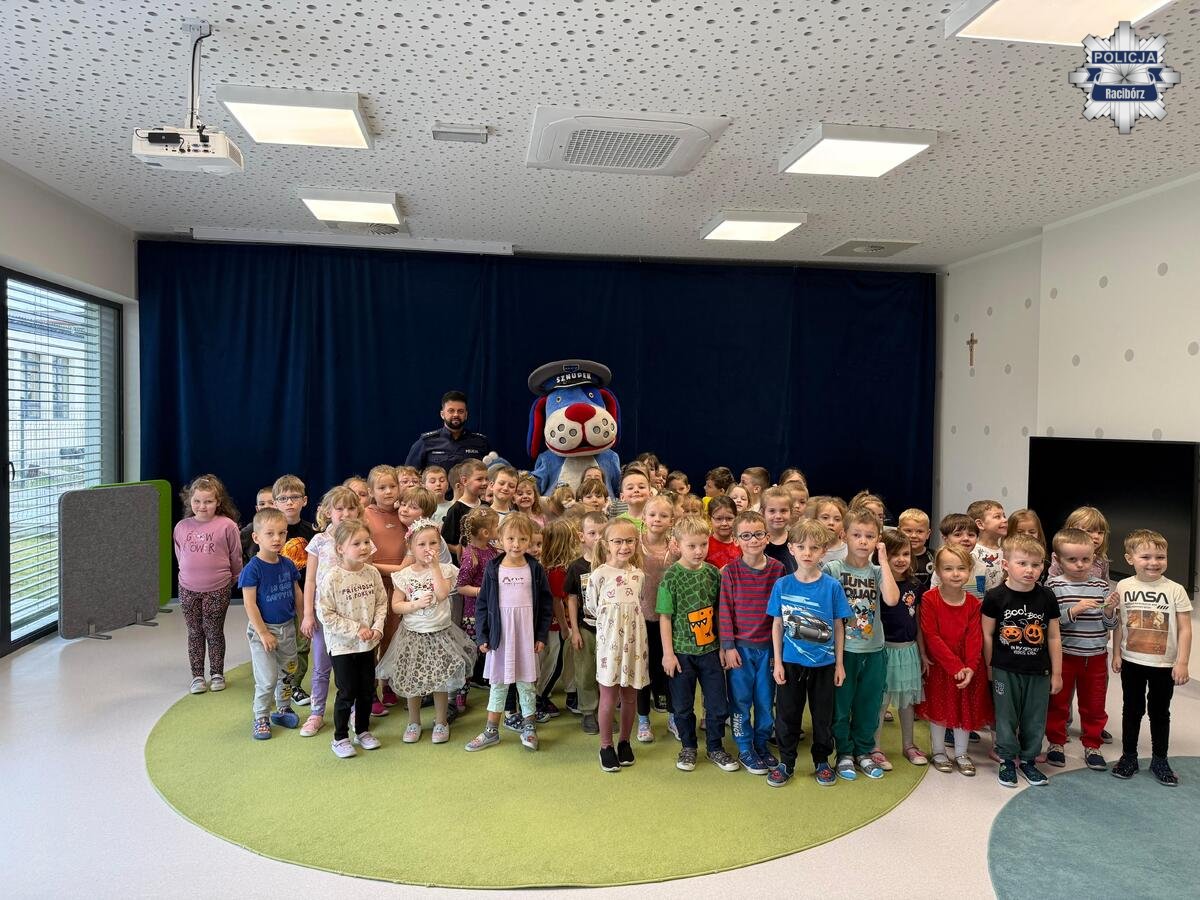 Policjant z Raciborza odwiedził Przedszkole nr 17, gdzie przeprowadził spotkanie profilaktyczne z najmłodszymi. Podczas pogadanki funkcjonariusz przypomniał dzieciom podstawowe zasady bezpieczeństwa oraz opowiedział, jak należy zachować się w sytuacjach zagrożenia. W spotkaniu uczestniczyła także policyjna maskotka Sznupek, która towarzyszyła policjantowi podczas rozmów z przedszkolakami.