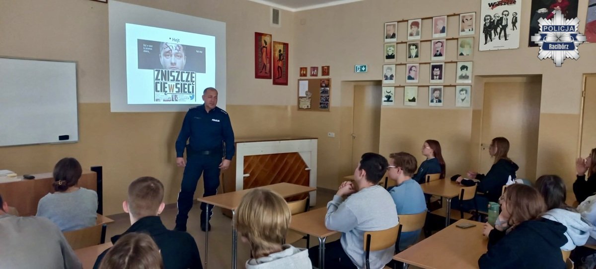 Aspirant sztabowy Krzysztof Biskup, dzielnicowy z Komendy Powiatowej Policji w Raciborzu, spotkał się z uczniami II Liceum Ogólnokształcącego w Raciborzu. Podczas prelekcji funkcjonariusz poruszył ważne dla młodzieży tematy – hejt w internecie, cyberzagrożenia oraz problem uzależnień od narkotyków i alkoholu. Spotkanie miało charakter profilaktyczny i miało na celu zwiększenie świadomości młodych ludzi w zakresie bezpieczeństwa.