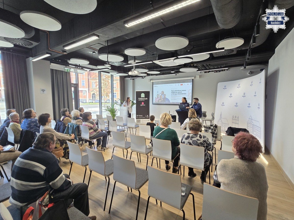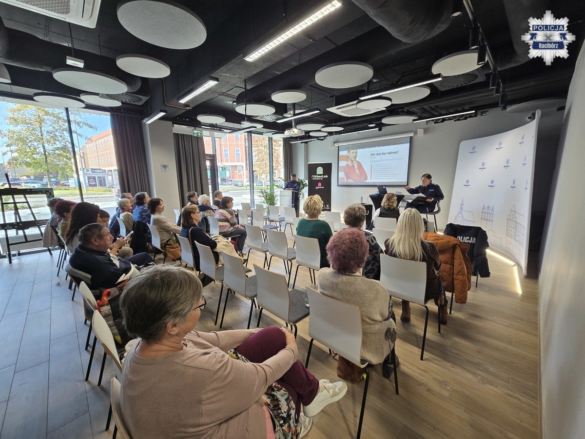 Raciborscy policjanci wraz z przedstawicielką ZUS podczas wczorajszego spotkania w UrbanLab szczegółowo omawiali sposoby ochrony seniorów przed oszustami oraz zagrożeniami w codziennym życiu. Mundurowi poruszyli kwestie bezpieczeństwa osobistego, finansowego i cyfrowego, przekazując uczestnikom praktyczne wskazówki, jak rozpoznawać podejrzane sytuacje i reagować w sytuacjach zagrożenia.