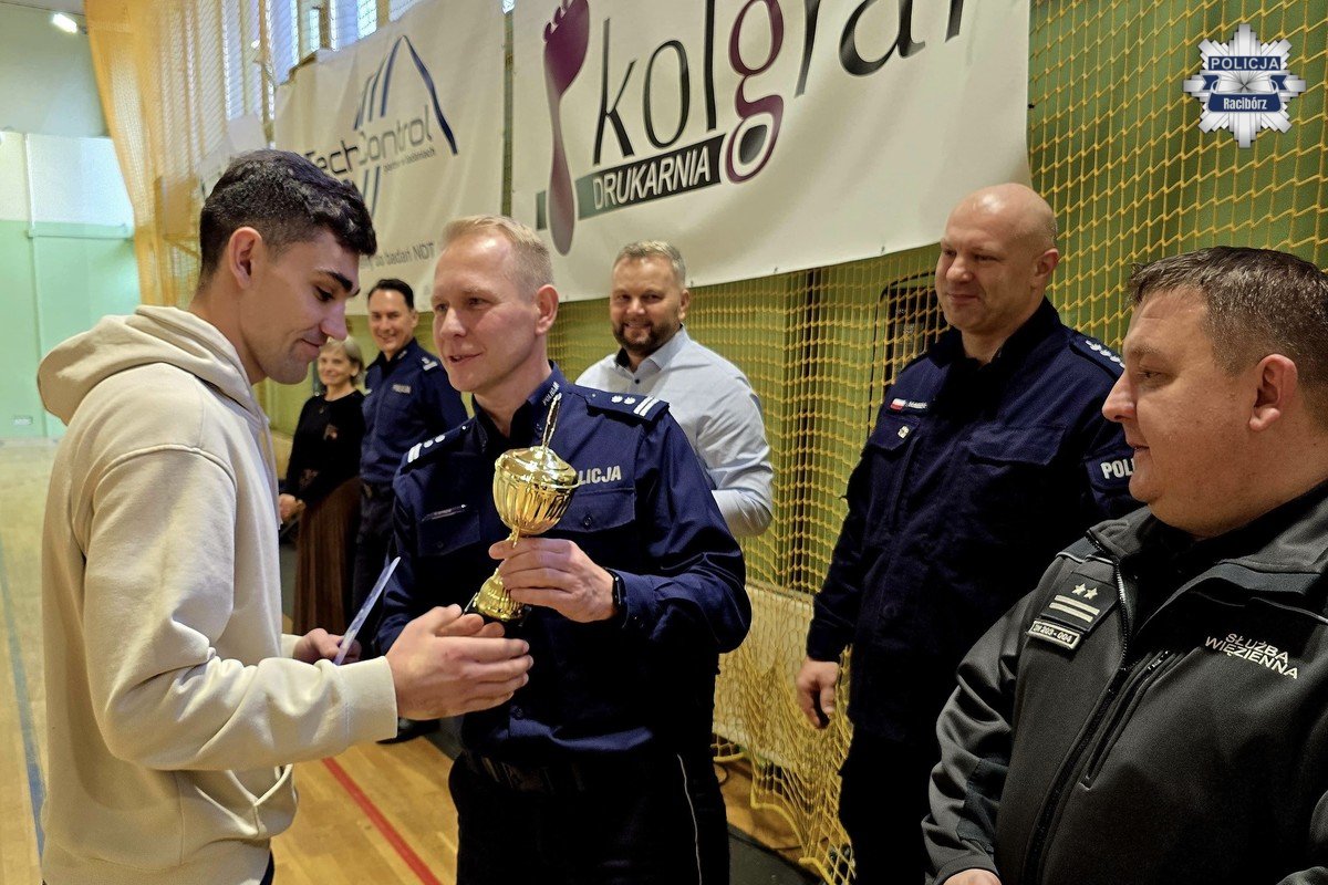 Puchary i dyplomy wręczyli organizatorzy tego przedsięwzięcia. Burmistrz Wojciech Gdesz podziękował za udział w turnieju i zapowiedział kolejną edycję wydarzenia, podkreślając jego rolę w promocji akcji „Movember” oraz aktywności fizycznej służb mundurowych. Komendant Powiatowy Policji mł.insp. Tomasz Hynek złożył serdeczne gratulacje zwycięzcom, zwracając uwagę na znaczenie regularnego uprawniania sportu dla sprawności funkcjonariuszy. Puchary i dyplomy zostały ufundowane przez Terenowy NSZZ Policjntów w Raciborzu. Na zakończenie wszyscy uczestnicy wykonali wspólne, pamiątkowe zdjęcie.