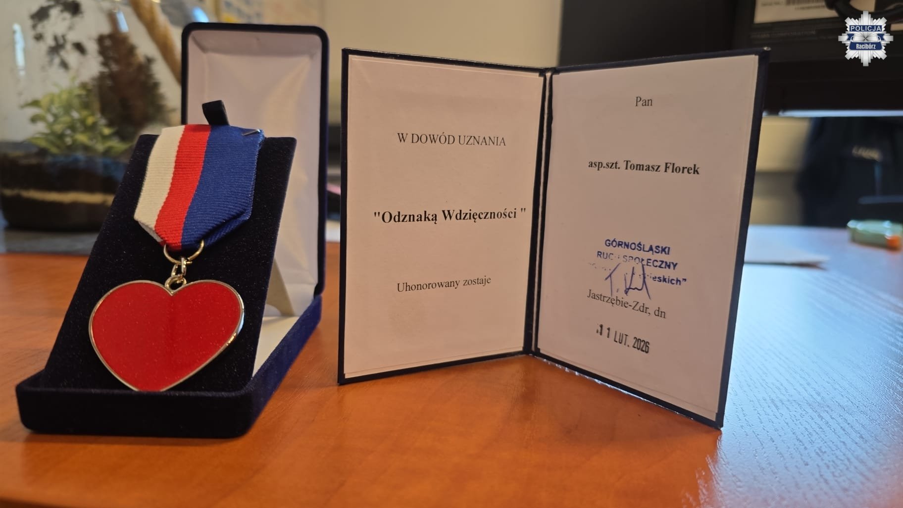 Aspirant sztabowy Tomasz Florek z wydziału ruchu drogowego raciborskiej komendy został wyróżniony „Odznaką Wdzięczności” przyznaną przez Górnośląski Ruch Społeczny. Odznaczenie stanowi wyraz uznania za jego zaangażowanie, gotowość do niesienia pomocy oraz empatię wobec mieszkańców. Wyróżnienie jest podziękowaniem za codzienną służbę i budowanie zaufania w lokalnej społeczności.